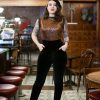 The Lizabeth Top is shown with the Marilyn Jeans and with black velvet Audrey Cigarette Pants, a white Barbie Top, and a white Charlotte Beret. Gretchen also wears a blue Lizabeth Top with a Charm Circle Skirt, and Susie is wearing a white Lizabeth Top underneath the blue plaid Pep Rally Skirt.